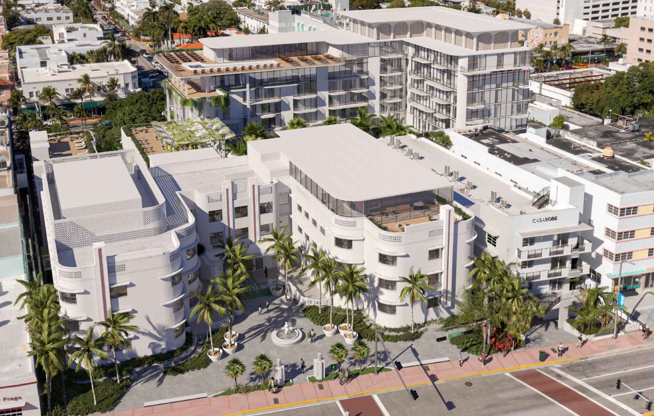 An application has been filed requesting a Certificate of Appropriateness for the total demolition and partial reconstruction of two contributing buildings including the construction of a new addition, the partial demolition and renovation of two contributing buildings including the construction of a 1-story rooftop addition, the total demolition of a non-contributing building, one or more waivers and site improvements, as part of a new hotel development.